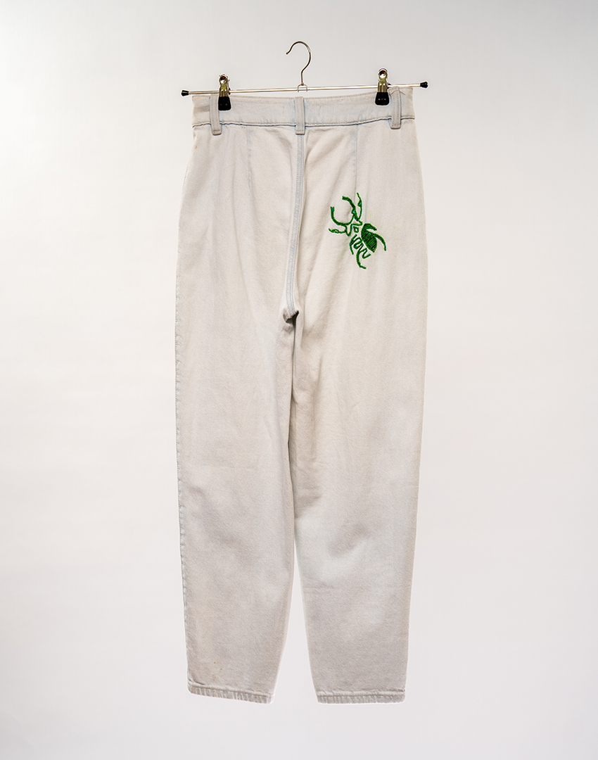 Akire logo, the scarab beetle beaded on the back pockets as part of our signature story.